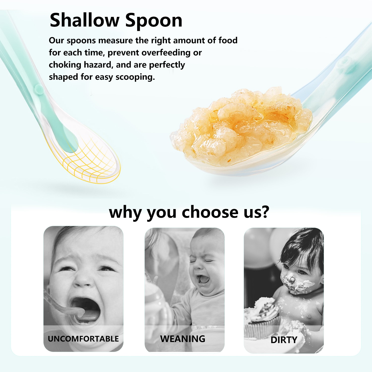 2.Gentle on baby's gums and the pleasing sensations of silicone make your baby want to eat. The spoons help alleviate your baby’s anxiety due to sore gums during the teething stage.