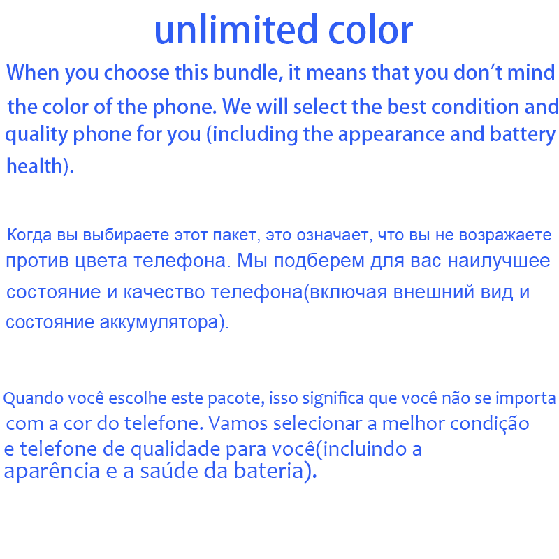 "Unlimited Color" : it means that you don't mind the color of the phone. We will select the best condition and quality phone for you (including the appearance and battery health).