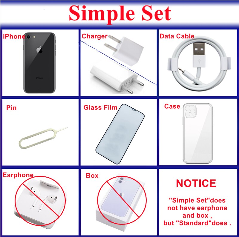 "64GB simple set" means you will get iPhone 8 64GB with Wall charger + Data cable(No original box, No earphone);