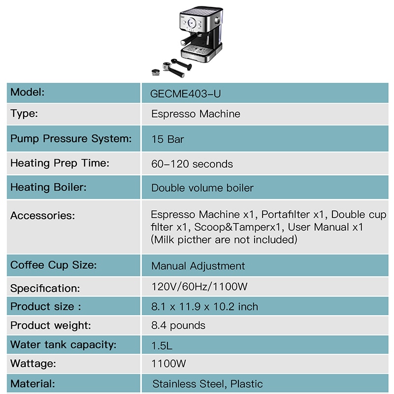 Gevi Espresso Machine 15Bar Coffee Machine Semi-automatic Household Coffee Maker with Foaming Milk Frother Wand 1100W GECME403-U