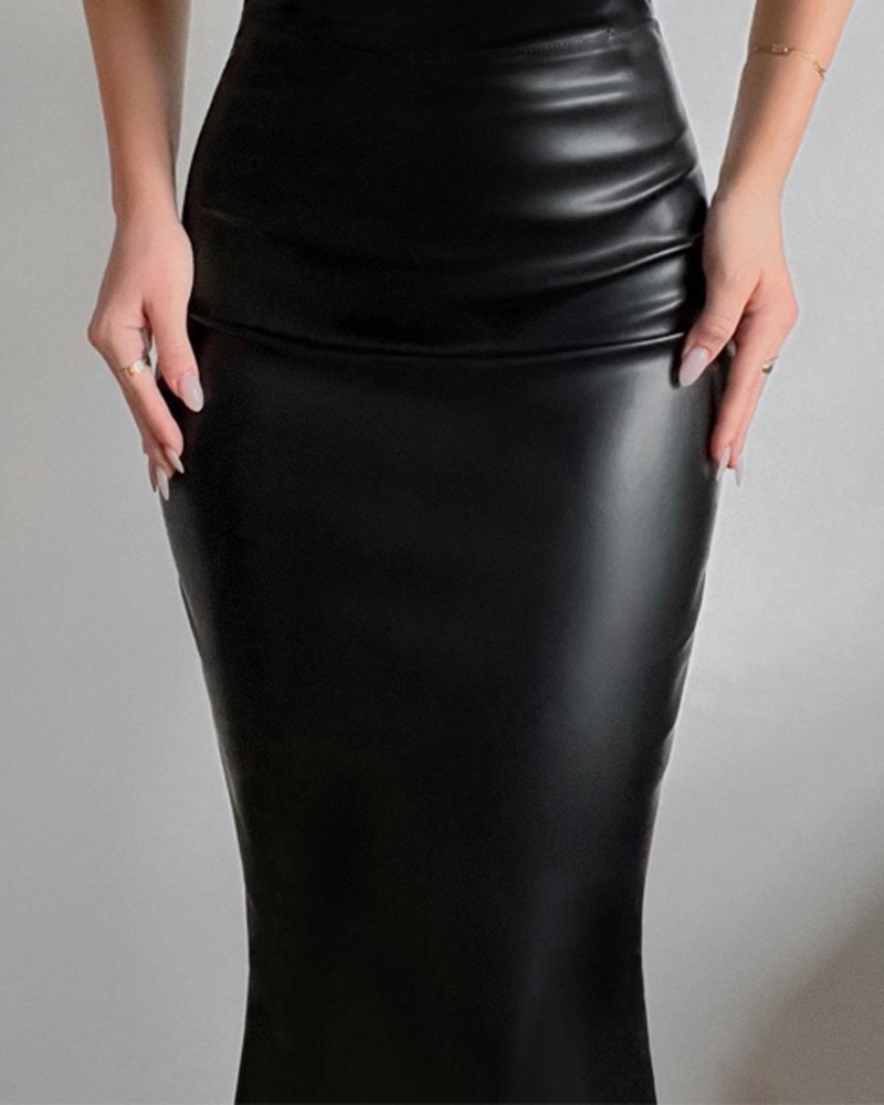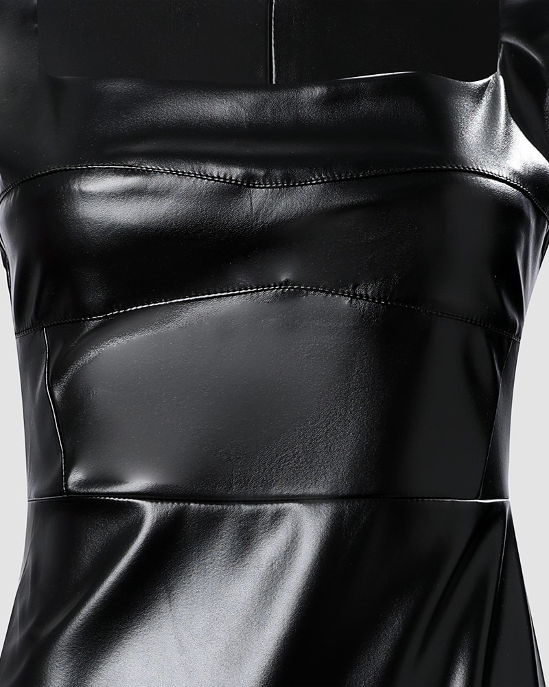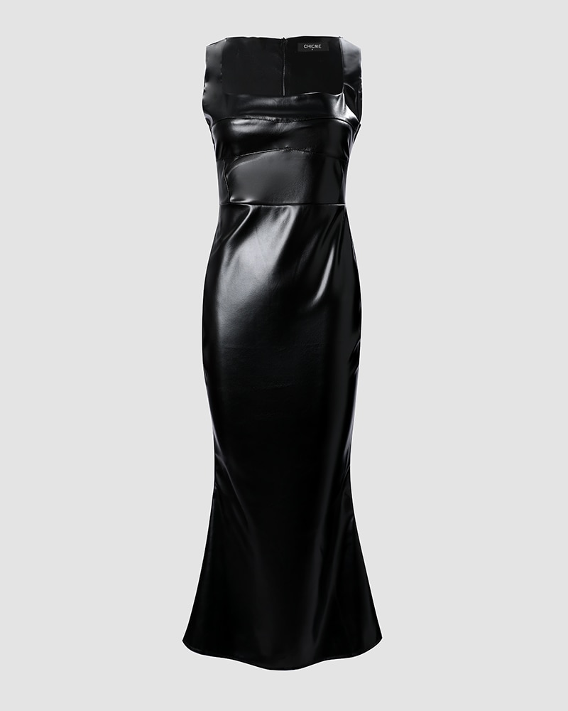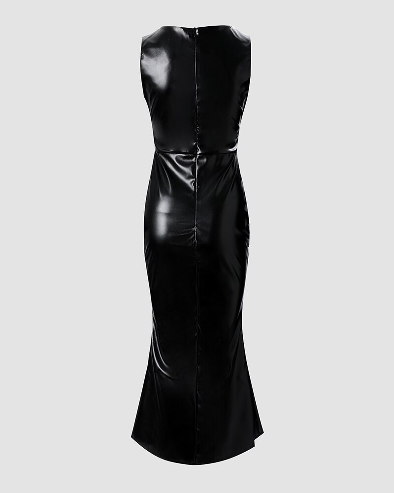 Sleeveless PU Leather Bodycon Dress Women Long Slim Skinny Solid Color Fashion Casual Ankle Length Dress