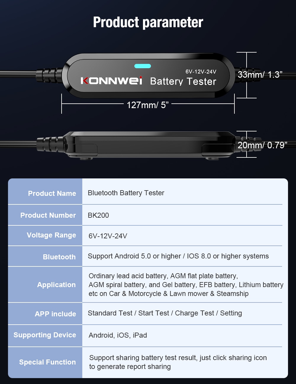 KONNWEI BK200 Bluetooth 5.0 Car Motorcycle Truck Battery Tester 6V 12V 24V Battery Analyzer 2000 CCA Charging Cranking Test Tool