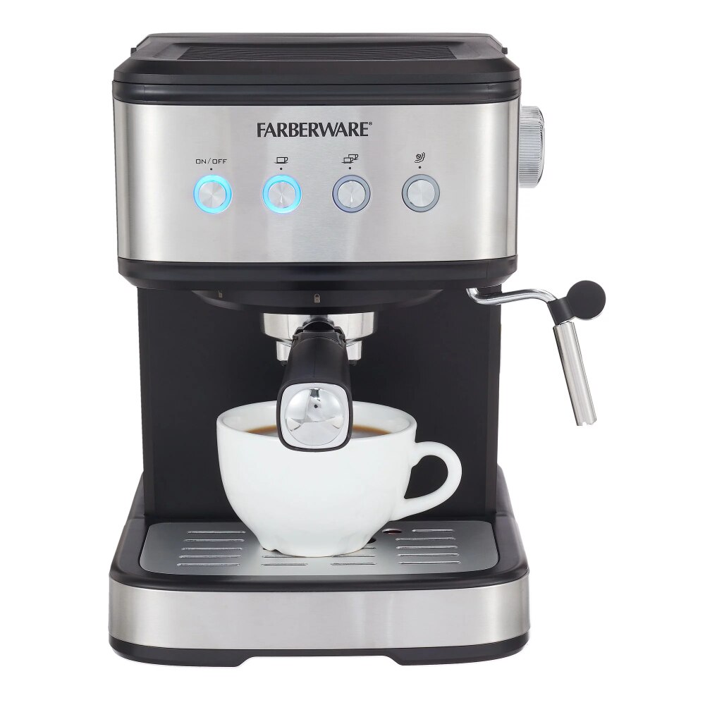 Espresso Maker, Black brews espresso shots, lattes, and cappuccino with a full-service espresso maker Die-casting aluminum alloy boiler heats water to the perfect temperature for espresso Equipped with single and double cup stainless-steel and frothing wand 1.5-liter water tank and drip tray are detachable for easy cleaning. Whether it's to make a latte or a double shot of caffeine, the Farberware 20-Bar Espresso Maker can press your morning espresso just the way you need. The 20 Bar powerful pressure and boiler heating system heats up water to the perfect temperature for homemade lattes and cappuccinos while a high-pressure frothing wand can steam milk for foam. The set comes complete with a single and double cups stainless steel ffor a perfectly pressed espresso powder. With overheating and over pressure protection, the Farberware 20-Bar Espresso Maker brews authentic barista-quality espresso beverages.