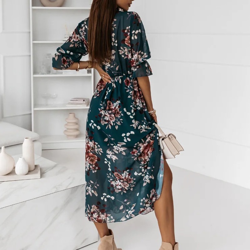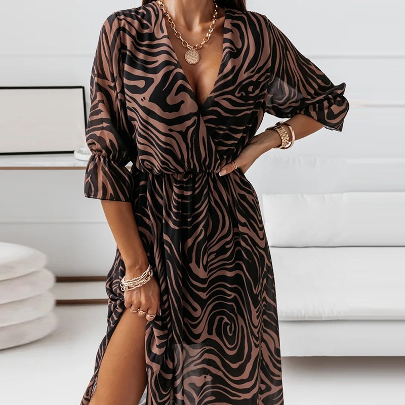 Women Sexy Side Slit Dress Elegant Ruffle Sleeves Printing Holiday Beach Dresses Vestidos Summer V-Neck Lace Up Sundress Dresses