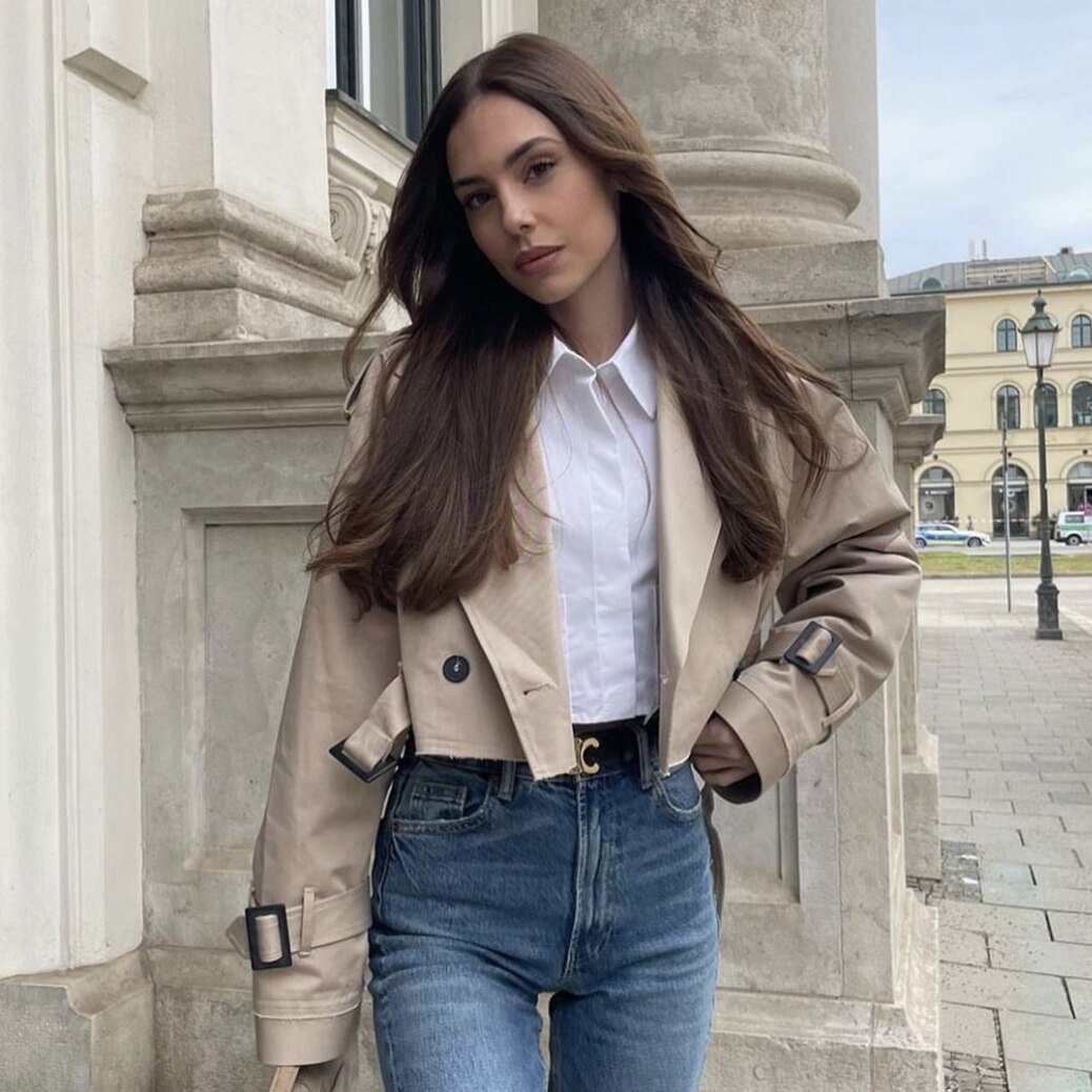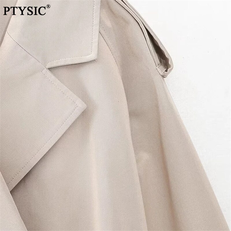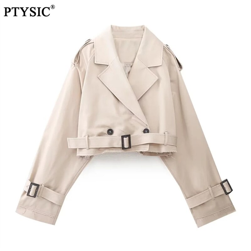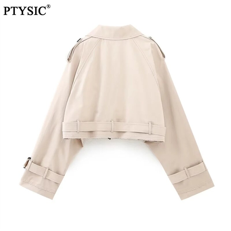 PTYSIC Women Vintage Oversize Cropped Trench Coat Long Sleeves With Tabs Belt Double Breasted Button Coat Jacket