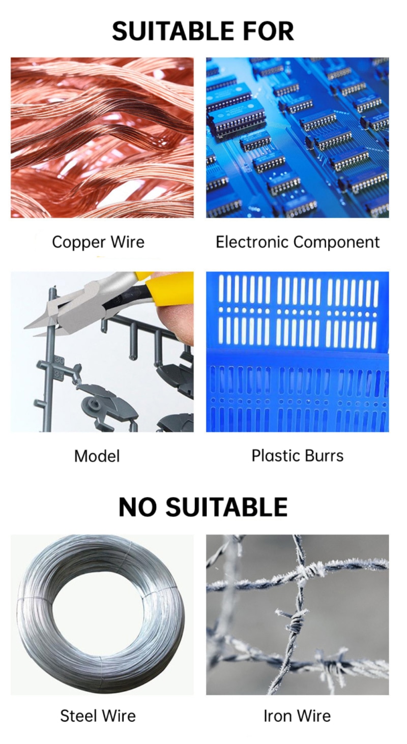 - Suiable for soft metal wire below 6mm, iron wire below 0.8mm, plastic burrs, component feet, jewelry making, models, etc.