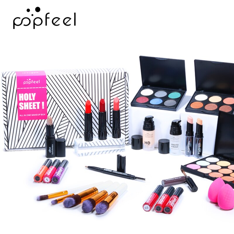 Products include: 1*cosmetic bag, 3*lipstick, 1*lipstick tray, 1*makeup primer, 1*mascara, 1*concealer tray, 2*concealer stick, 1*liquid foundation, 1*concealer, 2* Eyeshadow palette, 6*lip glaze, 1*brow cream, 1*exfoliating, 5*makeup brush, 2* , 1*eyebrow pencil