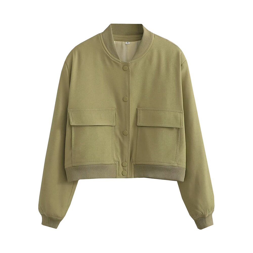 Casual Dark Blue Bomber Jacket Spring Women Fashion Single Breasted Cropped Outerwear Ladies Chic Street Pocket Coat Spring