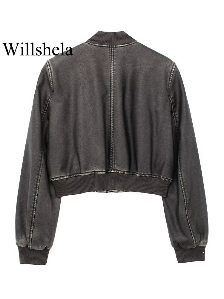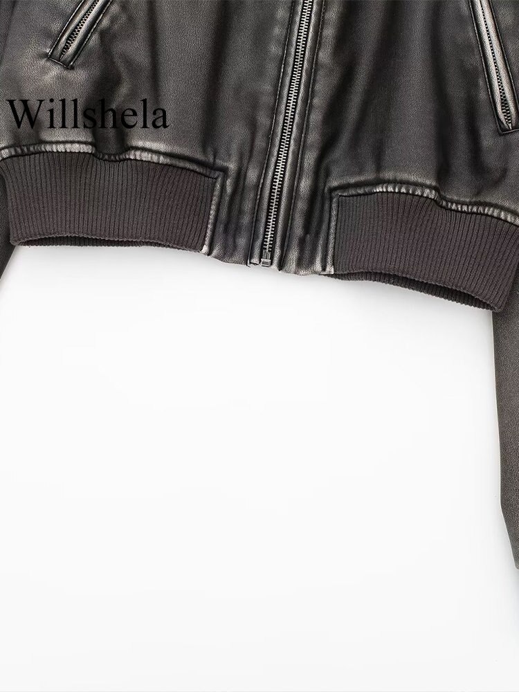 Willshela Women Fashion With Pockets Faux Leather Bomber Jacket Black Front Zipper Vintage O-Neck Long Sleeves Female Chic Lady