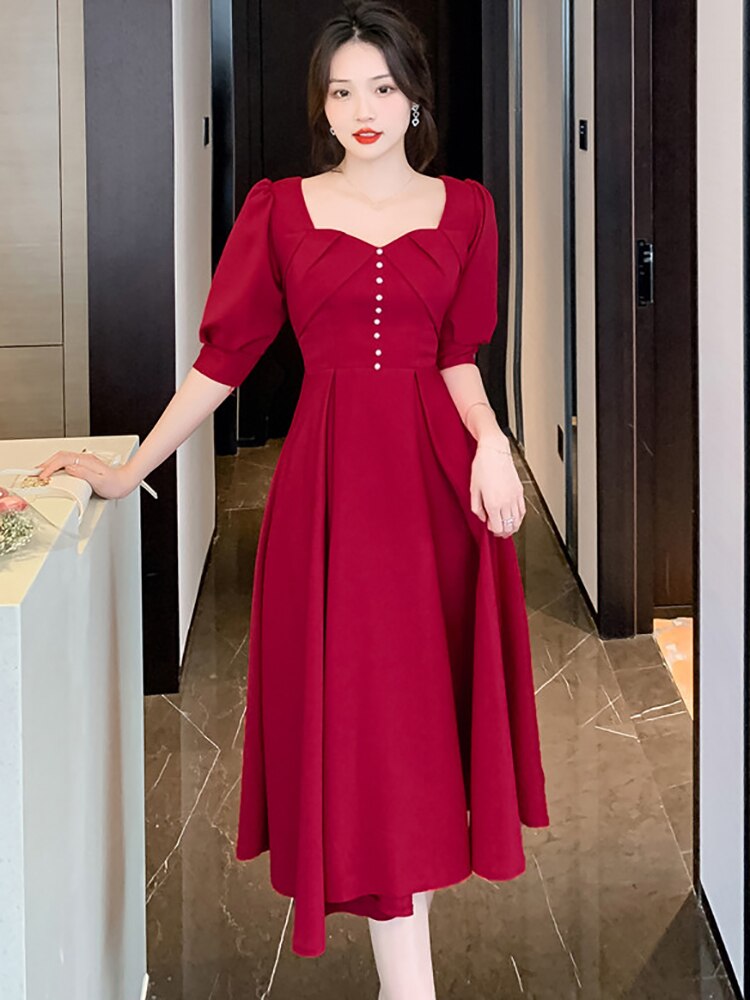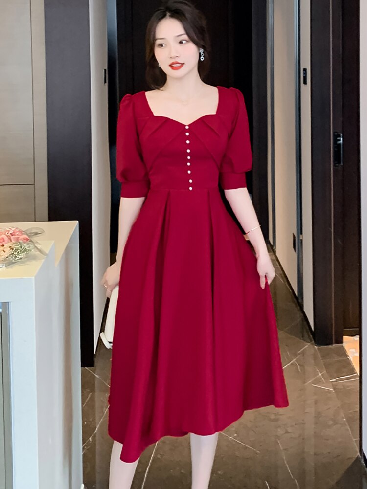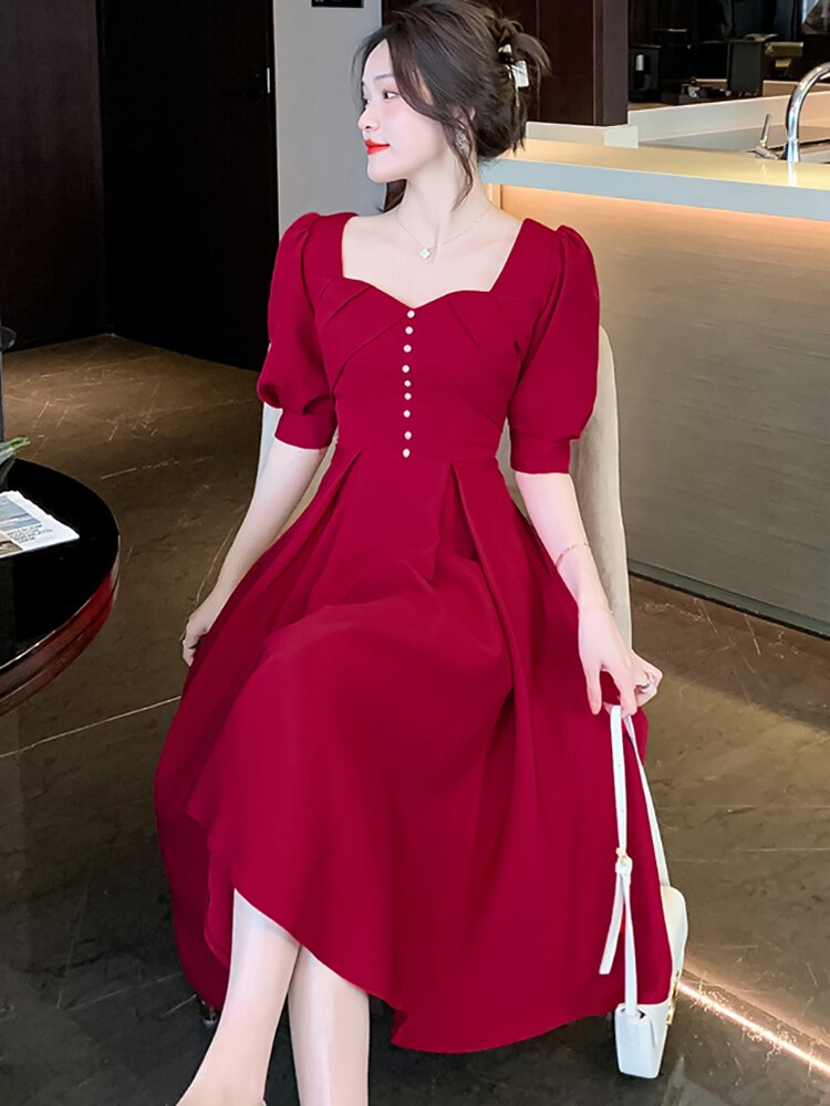 HUTI WJWYL New Arrival High Quality Women Red Puff Sleeve Square Collar Wedding Dress Summer Fashion Luxury Elegant Long Dress Korean Vintage Bodycon Vestidos