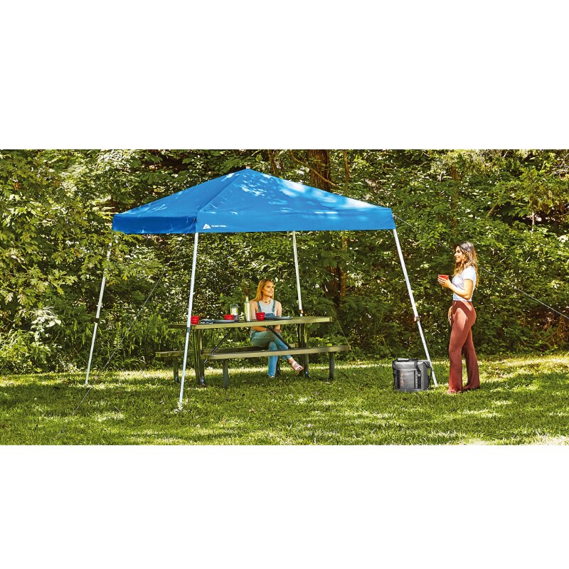 Make outdoor events even cooler with this Ozark Trail 10' x 10' Slant Leg Canopy. It's made with a powder-coated steel frame that provides long-lasting durability and the blue polyester top provides 64 square feet of shade with a UPF of 50+. Push-buttons on the frame allow it to lock safely into place and adjust the height as needed. This shelter includes stakes and guy ropes. Use the canopy for outdoor picnics, at the campground or at the ball fields.