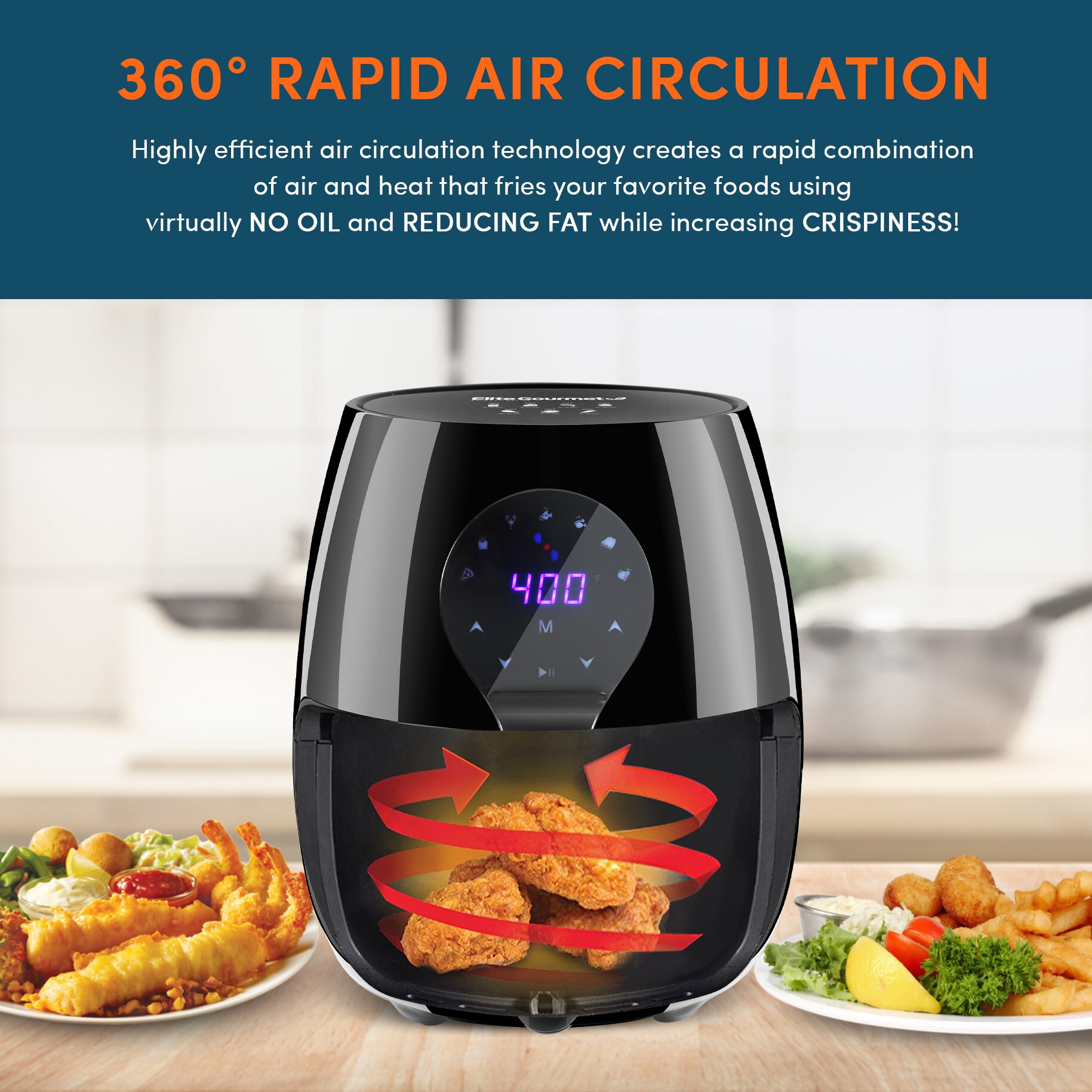 - Unlike conventional deep fryers, the Oil-Free Rapid Air Fryer`s unique heating system combined with circulating hot air will automatically make foods crispier and of course healthier without oil.