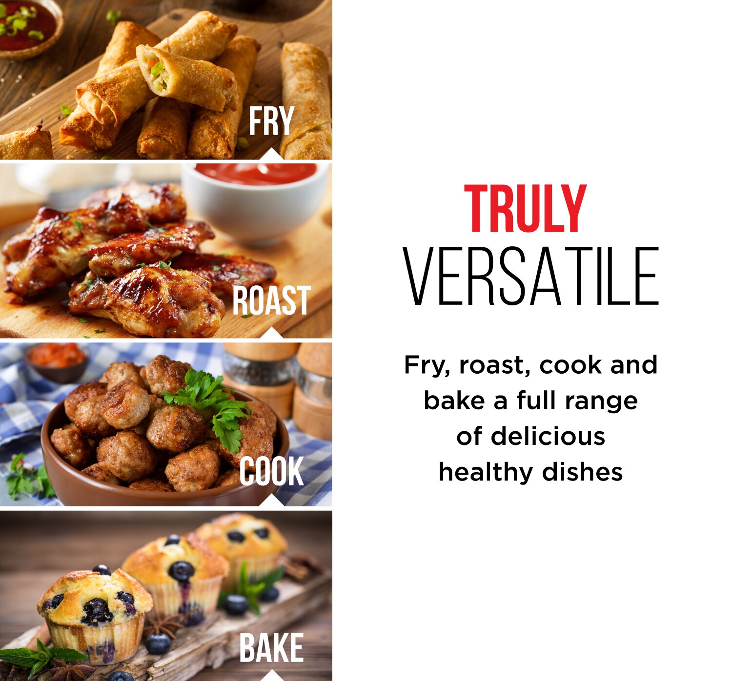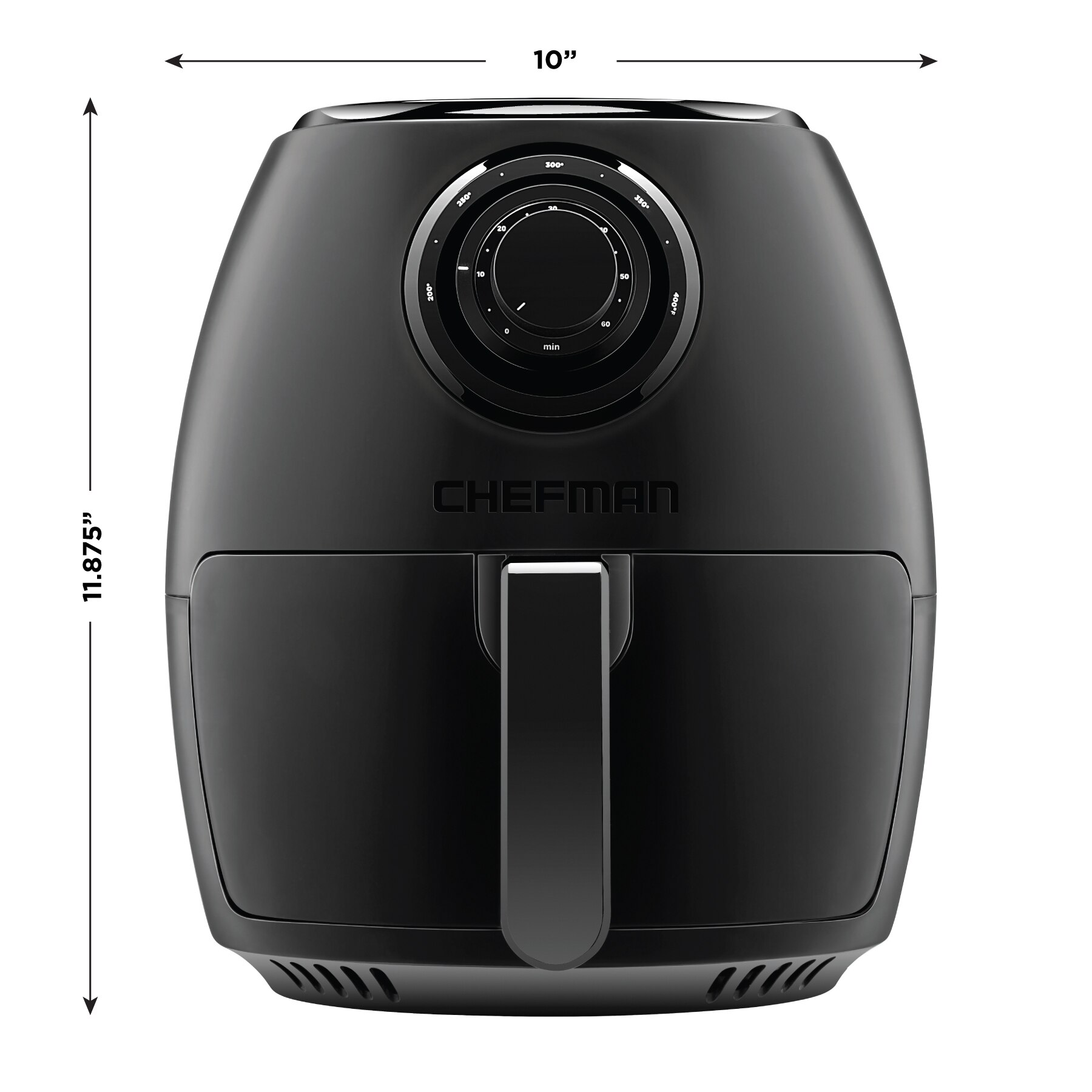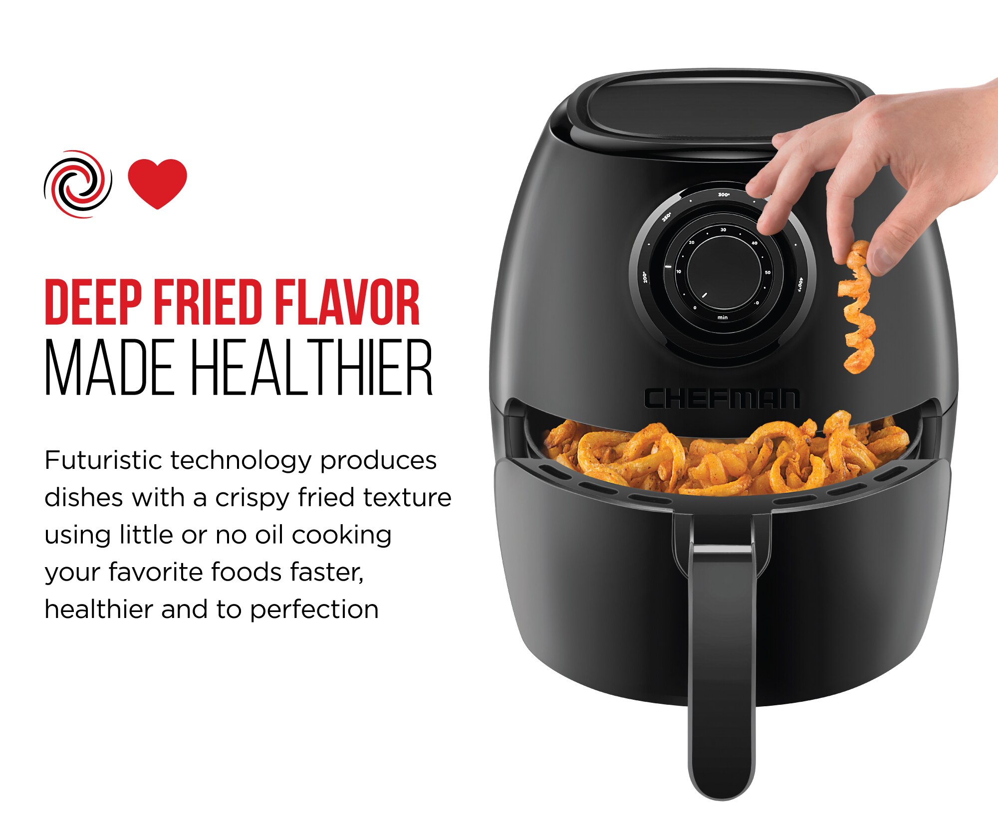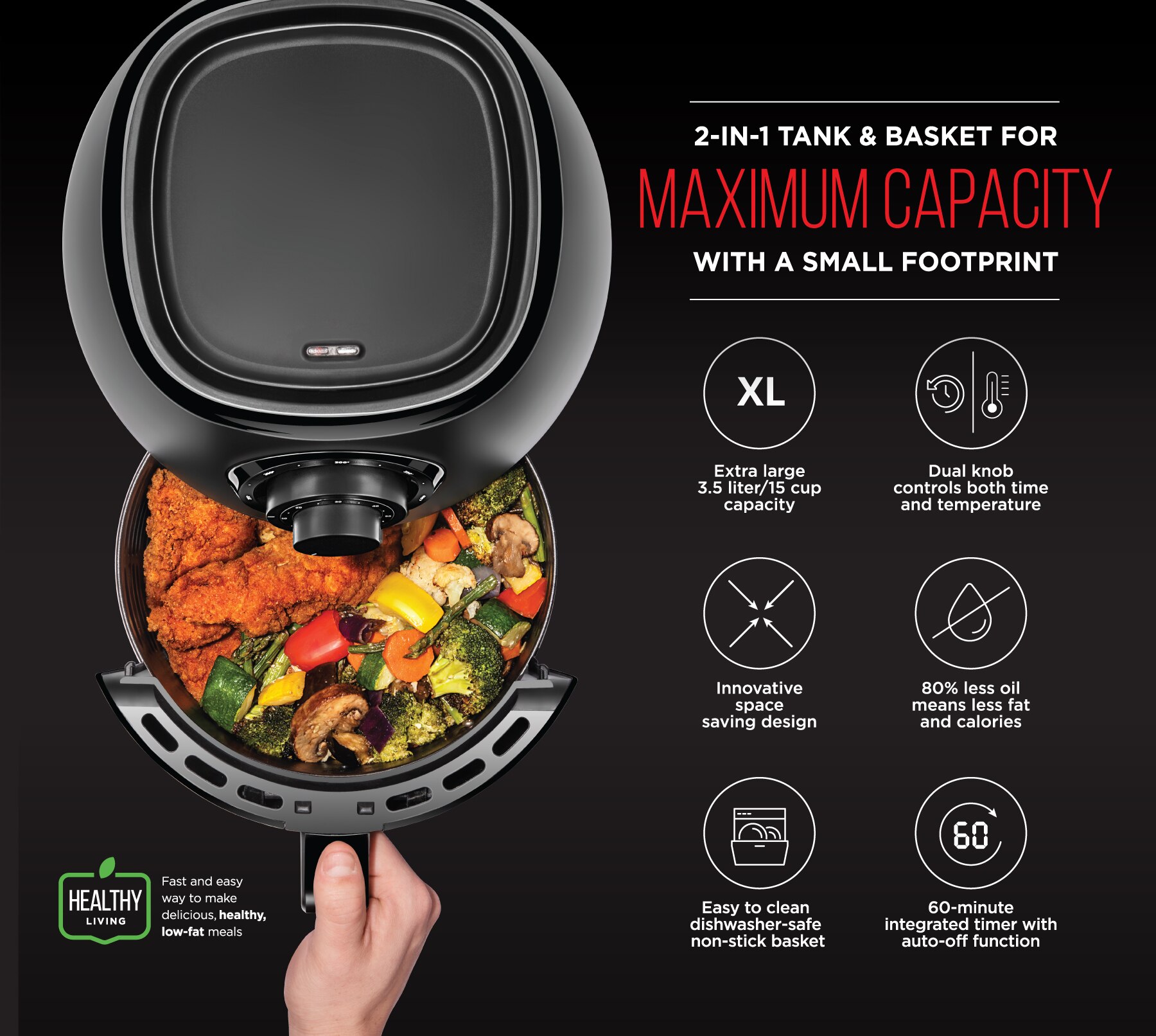 Achieve the deep-fried flavor you love, without all the oil and added calories. The TurboFry™ Air Fryer allows you to bake, fry, and roast like a pro. This air fryer requires little to no oil, so there`s less of that fried oil smell lingering in the house and less fat that you`re consuming. Its large 3.6-quart capacity and flat basket give you the ability to cook enough for a hungry crowd all at once. Skip the microwave! Reheat soggy leftovers in the air fryer to return them to their original texture. Make better-for-you fries that are just as crispy and tasty, roast chicken thighs, or heat up leftovers for a quick and easy meal. The temperature control with a 60-minute timer automatically shuts off once the food is done, so you never have to worry about burning or drying out your food. Its space-saving basket is removable and dishwasher safe for easy clean-up, so you`ll have more time to dream up your next air-fried meal! cETL is approved with advanced safety technology for long-lasting durability. 1200 Watts/120 Volts - RJ38-V3-DC35.